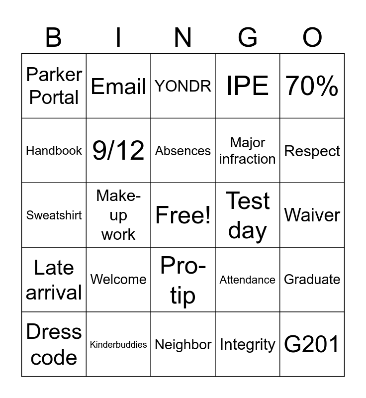 This bingo card has a free space and 51 words: D104, G201, E203, Neighbor, Welcome, Team, Email, add/drop, Handbook, Level change, 9/12, IPE, Graduate, Attendance, Tardy, Upper school office, Absences, Test day, Assessment, 70%, Make-up work, Integrity, Parker Portal, Major infraction, Minor infraction, Plagiarism, Respect, Infraction, Dress code, YONDR, Ripped jeans, Senior pictures, Yearbook, Studio M., Senior sunrise, Kinderbuddies, SK, Leader, Campus visit, Scoir, Waiver, Late arrival, Early departure, Senior lunch, Counseling paperwork, Off-campus lunch, Sweatshirt, Parker ID, Permission slip, Pro-tip and Little-ones.