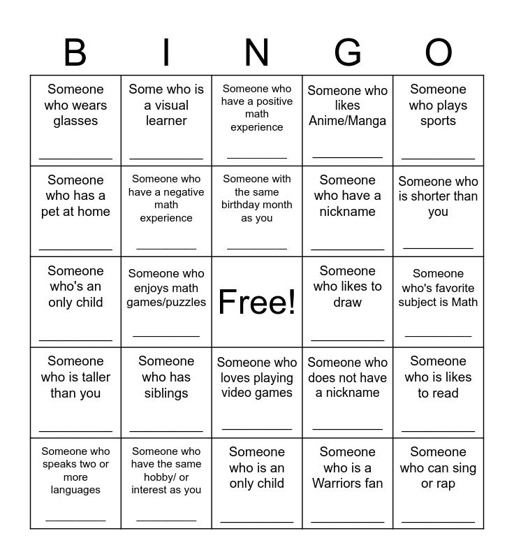 This bingo card has a free space and 24 words: Someone who has siblings __________, Someone who have the same hobby/ or interest as you __________, Someone with the same birthday month as you __________, Someone who speaks two or more languages __________, Someone who plays sports __________, Someone who wears glasses __________, Someone who has a pet at home __________, Some who is a visual learner __________, Someone who likes to draw __________, Someone who loves playing video games __________, Someone who have a nickname __________, Someone who's an only child __________, Someone who does not have a nickname __________, Someone who is likes to read __________, Someone who have a negative math experience __________, Someone who is a Warriors fan __________, Someone who's favorite subject is Math __________, Someone who have a positive math experience __________, Someone who is shorter than you __________, Someone who enjoys math games/puzzles __________, Someone who can sing or rap __________, Someone who is taller than you __________, Someone who likes Anime/Manga __________ and Someone who is an only child __________.