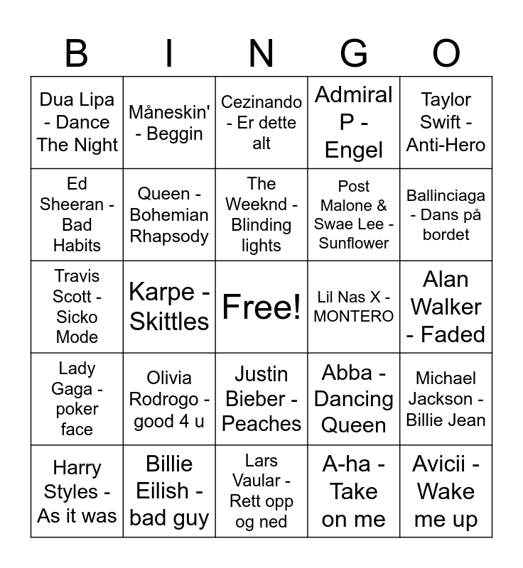 This bingo card has a free space and 24 words: Olivia Rodrogo - good 4 u, Billie Eilish - bad guy, The Weeknd - Blinding lights, Harry Styles - As it was, Taylor Swift - Anti-Hero, Dua Lipa - Dance The Night, Ed Sheeran - Bad Habits, Måneskin' - Beggin, Lil Nas X - MONTERO, Justin Bieber - Peaches, Post Malone & Swae Lee - Sunflower, Travis Scott - Sicko Mode, Abba - Dancing Queen, Michael Jackson - Billie Jean, Queen - Bohemian Rhapsody, A-ha - Take on me, Alan Walker - Faded, Cezinando - Er dette alt, Ballinciaga - Dans på bordet, Karpe - Skittles, Avicii - Wake me up, Lady Gaga - poker face, Admiral P - Engel and Lars Vaular - Rett opp og ned.