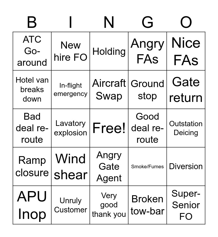 This bingo card has a free space and 24 words: Wind shear, Unruly Customer, Aircraft Swap, APU Inop, Nice FAs, ATC Go-around, Hotel van breaks down, New hire FO, Good deal re-route, Angry Gate Agent, Ground stop, Bad deal re-route, Smoke/Fumes, Diversion, In-flight emergency, Broken tow-bar, Outstation Deicing, Holding, Gate return, Lavatory explosion, Super-Senior FO, Ramp closure, Angry FAs and Very good thank you.