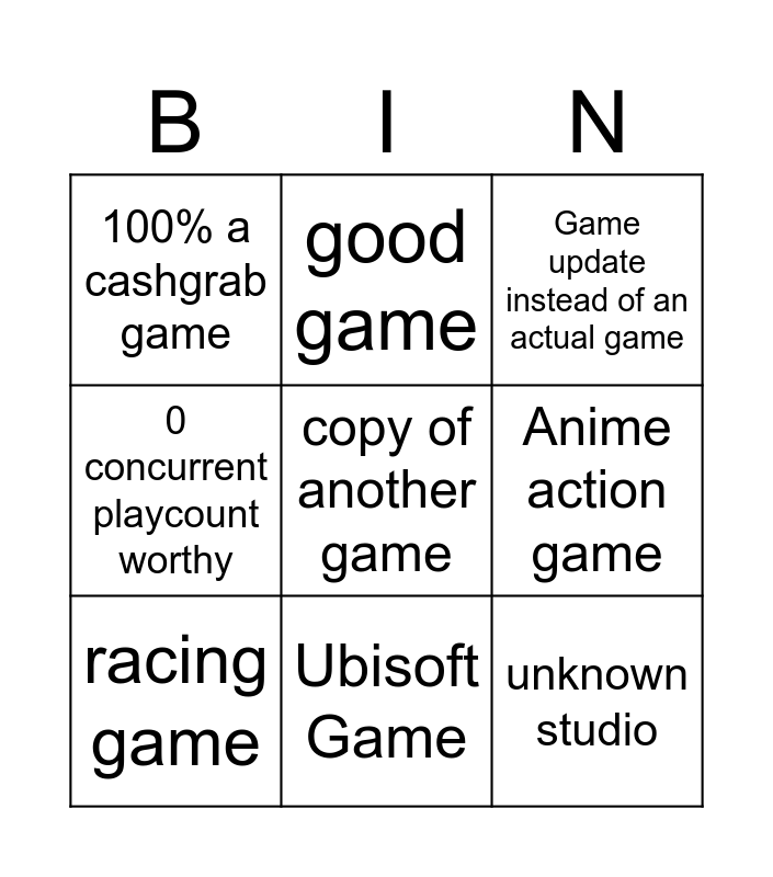 This bingo card has a free space and 8 words: Anime action game, Game update instead of an actual game, good game, racing game, 100% a cashgrab game, unknown studio, 0 concurrent playcount worthy and Ubisoft Game.