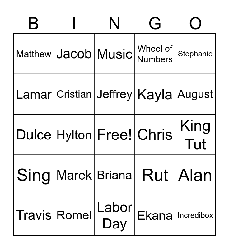 This bingo card has a free space and 24 words: Marek, Romel, Jeffrey, Travis, Stephanie, Matthew, Lamar, Jacob, Chris, Briana, Kayla, Dulce, Rut, Alan, Cristian, Ekana, King Tut, Music, August, Hylton, Incredibox, Sing, Wheel of Numbers and Labor Day.
