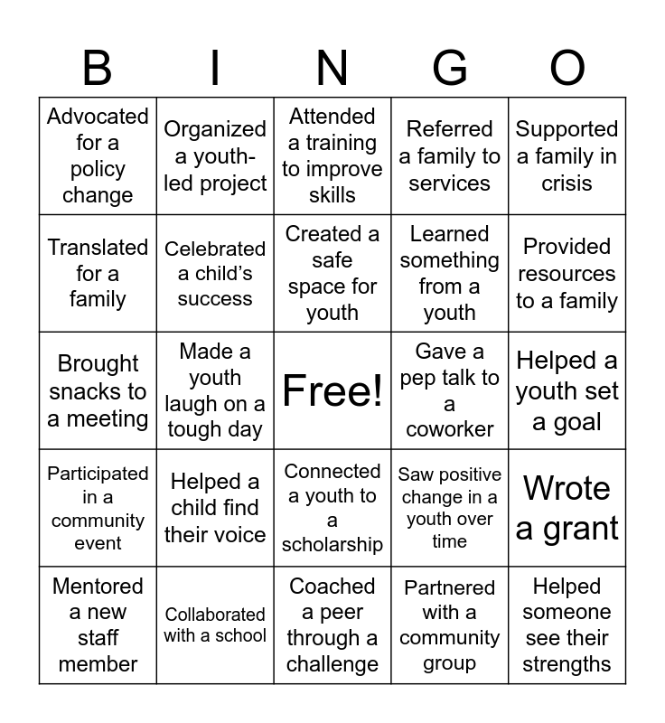 This bingo card has a free space and 24 words: Helped a child find their voice, Collaborated with a school, Created a safe space for youth, Mentored a new staff member, Supported a family in crisis, Advocated for a policy change, Translated for a family, Organized a youth-led project, Gave a pep talk to a coworker, Connected a youth to a scholarship, Learned something from a youth, Brought snacks to a meeting, Saw positive change in a youth over time, Wrote a grant, Celebrated a child’s success, Partnered with a community group, Helped a youth set a goal, Attended a training to improve skills, Provided resources to a family, Made a youth laugh on a tough day, Helped someone see their strengths, Participated in a community event, Referred a family to services and Coached a peer through a challenge.