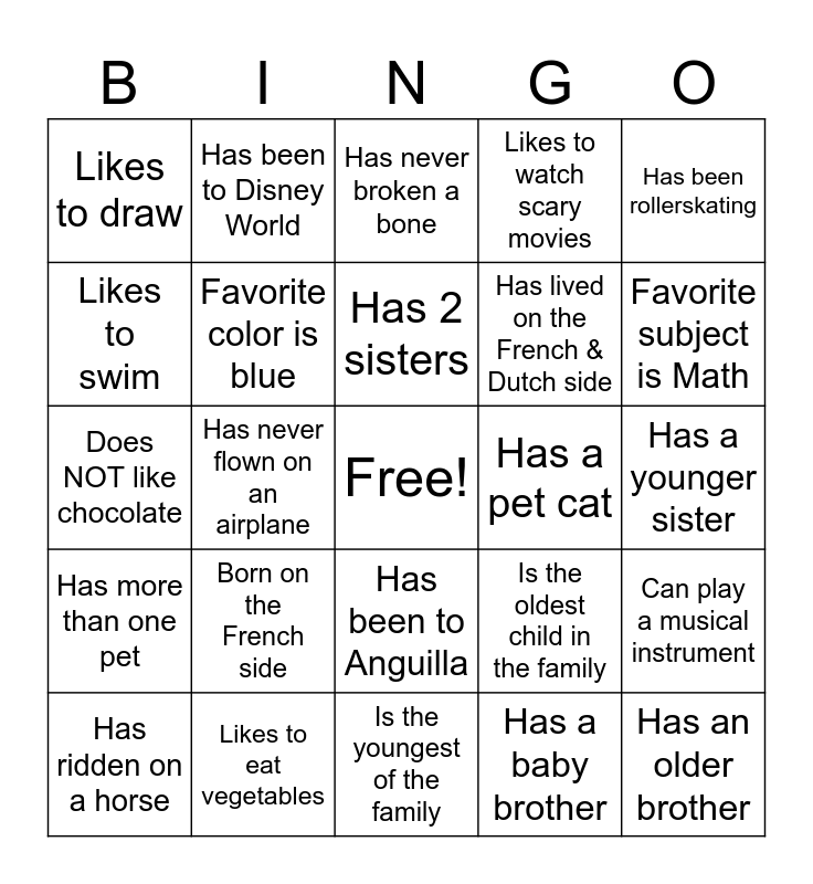 This bingo card has a free space and 24 words: Has ridden on a horse, Born on the French side, Has 2 sisters, Has a baby brother, Has been rollerskating, Likes to draw, Has been to Disney World, Has never broken a bone, Has a pet cat, Has a younger sister, Does NOT like chocolate, Favorite color is blue, Is the oldest child in the family, Can play a musical instrument, Likes to swim, Likes to eat vegetables, Is the youngest of the family, Likes to watch scary movies, Favorite subject is Math, Has more than one pet, Has never flown on an airplane, Has been to Anguilla, Has lived on the French & Dutch side and Has an older brother.