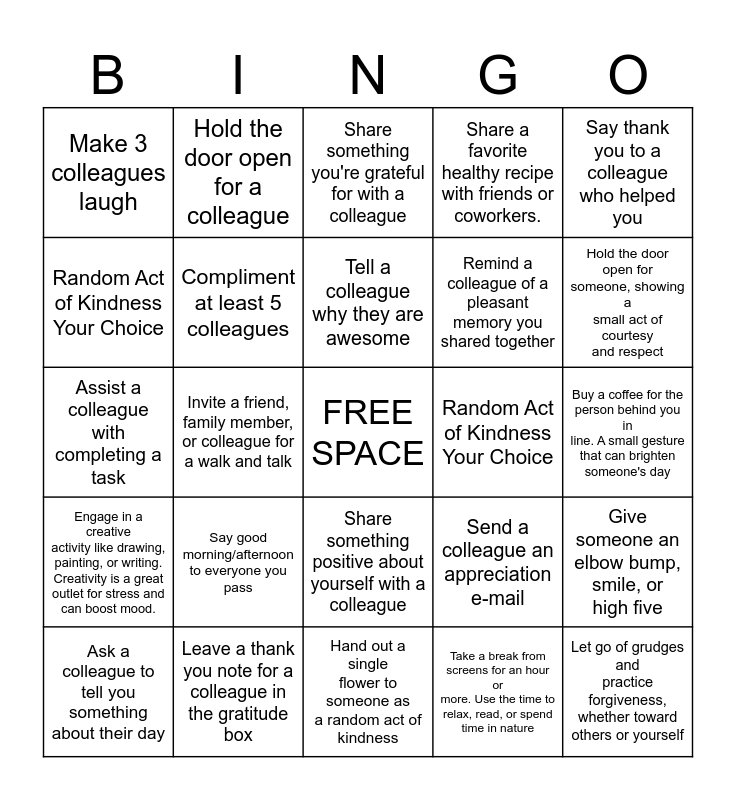 This bingo card has a free space and 24 words: Say good morning/afternoon to everyone you pass, Leave a thank you note for a colleague in the gratitude box, Tell a colleague why they are awesome, Ask a colleague to tell you something about their day, Say thank you to a colleague who helped you, Make 3 colleagues laugh, Random Act of Kindness Your Choice, Hold the door open for a colleague, Random Act of Kindness Your Choice, Share something positive about yourself with a colleague, Remind a colleague of a pleasant memory you shared together, Assist a colleague with completing a task, Send a colleague an appreciation e-mail, Give someone an elbow bump, smile, or high five, Compliment at least 5 colleagues, Take a break from screens for an hour or more. Use the time to relax, read, or spend time in nature, Buy a coffee for the person behind you in line. A small gesture that can brighten someone's day, Share something you're grateful for with a colleague, Hold the door open for someone, showing a small act of courtesy and respect, Invite a friend, family member, or colleague for a walk and talk, Let go of grudges and practice forgiveness, whether toward others or yourself, Engage in a creative activity like drawing, painting, or writing. Creativity is a great outlet for stress and can boost mood., Share a favorite healthy recipe with friends or coworkers. and Hand out a single flower to someone as a random act of kindness.