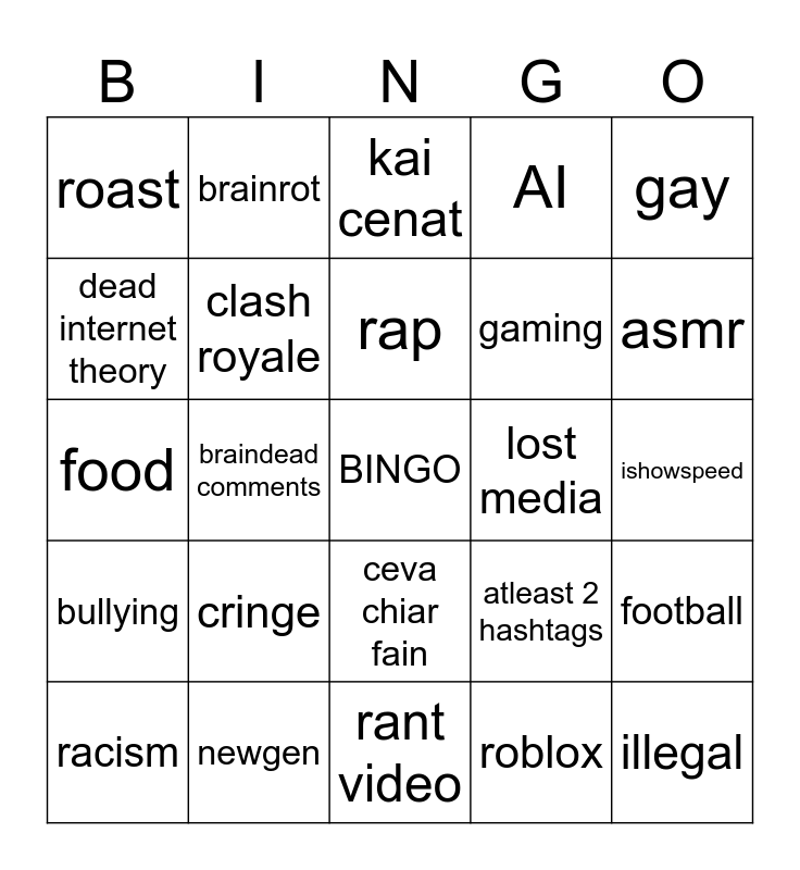 This bingo card has a free space and 24 words: cringe, newgen, rap, racism, gay, roast, dead internet theory, brainrot, lost media, ceva chiar fain, gaming, food, atleast 2 hashtags, football, clash royale, roblox, ishowspeed, kai cenat, asmr, braindead comments, illegal, bullying, AI and rant video.