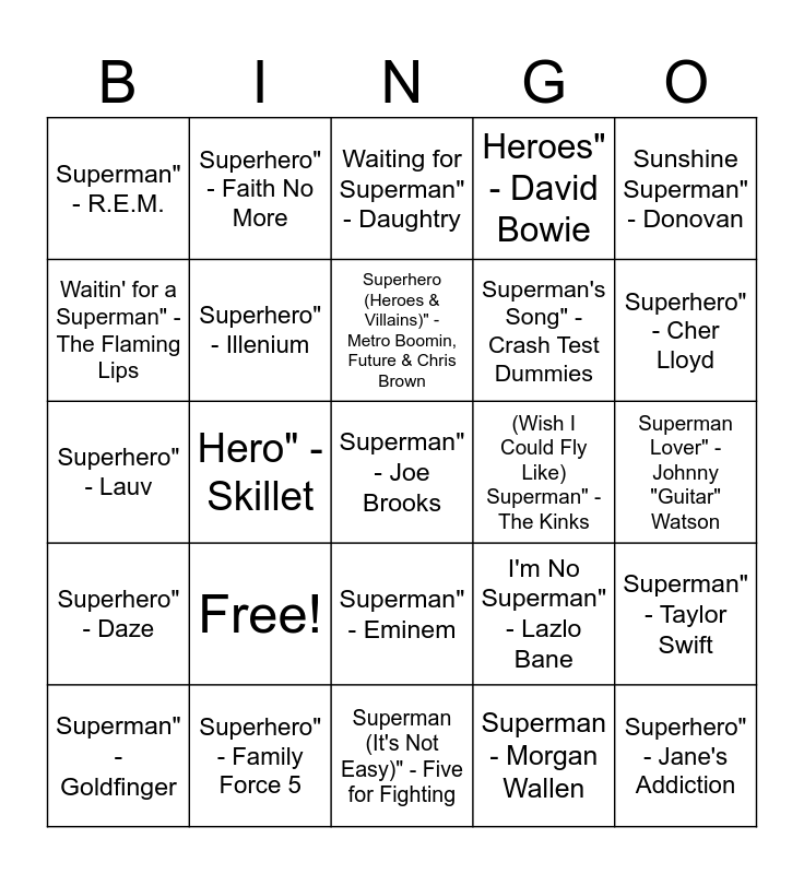 This bingo card has 25 words: Free!, Superman (It's Not Easy)" - Five for Fighting, Superhero (Heroes & Villains)" - Metro Boomin, Future & Chris Brown, Superman" - Goldfinger, Sunshine Superman" - Donovan, Superman" - R.E.M., Waitin' for a Superman" - The Flaming Lips, Superhero" - Faith No More, (Wish I Could Fly Like) Superman" - The Kinks, Superman" - Eminem, Superman's Song" - Crash Test Dummies, Superhero" - Lauv, I'm No Superman" - Lazlo Bane, Superman" - Taylor Swift, Superhero" - Illenium, Superhero" - Jane's Addiction, Superman Lover" - Johnny "Guitar" Watson, Waiting for Superman" - Daughtry, Superhero" - Cher Lloyd, Hero" - Skillet, Superman" - Joe Brooks, Superhero" - Family Force 5, Superhero" - Daze, Heroes" - David Bowie and Superman - Morgan Wallen.