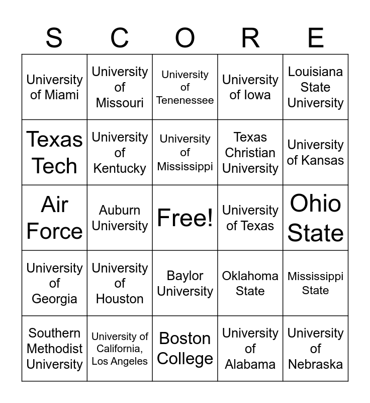 This bingo card has a free space and 32 words: University of Alabama, University of Arkansas, Auburn University, University of Florida, University of Georgia, University of Kentucky, Louisiana State University, Mississippi State, University of Missouri, University of Oklahoma, University of Mississippi, University of Tenenessee, University of Texas A&M, University of Colorado, University of Texas, University of Southern California, Southern Methodist University, Air Force, Baylor University, University of Houston, Oklahoma State, University of Oregon, Ohio State, University of California, Los Angeles, University of Nebraska, University of Iowa, Texas Christian University, Texas Tech, University of Miami, Boston College, Texas State and University of Kansas.