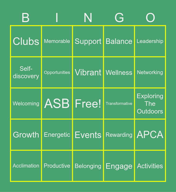 This bingo card has a free space and 34 words: Community, Engage, Team, Social, Growth, Opportunities, Leadership, Acclimation, Memorable, Collaborative, Vibrant, Support, Stimulating, Diverse, Transformative, Networking, Productive, Welcoming, Energetic, Rewarding, Events, Relationships, Clubs, Exploring The Outdoors, Belonging, Activities, Balance, Confidence, Wellness, Self-discovery, Mental Health Wellness, ASB, APCA and Advocate.