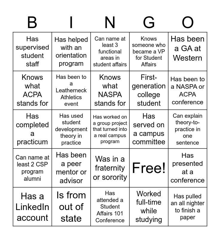 This bingo card has 25 words: Has been a peer mentor or advisor, Has attended a Student Affairs 101 Conference, Knows what NASPA stands for, Has a LinkedIn account, Has been a GA at Western, Has supervised student staff, Knows what ACPA stands for, Has helped with an orientation program, Has served on a campus committee, Was in a fraternity or sorority, First-generation college student, Has completed a practicum, Free!, Has presented at a conference, Has been to a Leatherneck Athletics event, Has pulled an all nighter to finish a paper, Can explain theory-to-practice in one sentence, Can name at least 3 functional areas in student affairs, Has been to a NASPA or ACPA conference, Has used student development theory in practice, Has worked on a group project that turned into a real campus program, Is from out of state, Can name at least 2 CSP program alumni, Knows someone who became a VP for Student Affairs and Worked full-time while studying.