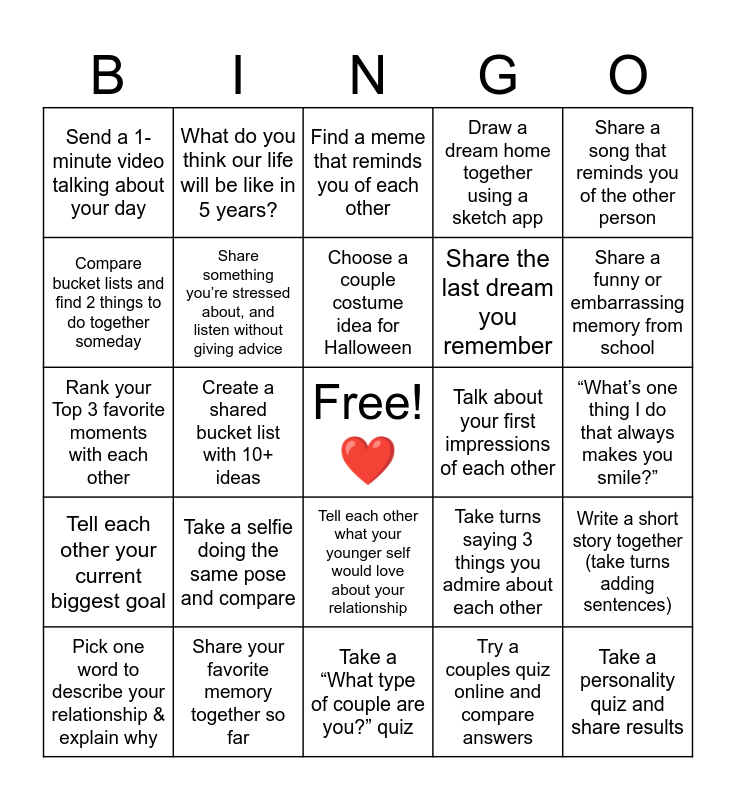 This bingo card has a free space and 24 words: Take a selfie doing the same pose and compare, Share your favorite memory together so far, Choose a couple costume idea for Halloween, Pick one word to describe your relationship & explain why, Share a song that reminds you of the other person, Send a 1-minute video talking about your day, Compare bucket lists and find 2 things to do together someday, What do you think our life will be like in 5 years?, Talk about your first impressions of each other, Tell each other what your younger self would love about your relationship, Share the last dream you remember, Rank your Top 3 favorite moments with each other, Take turns saying 3 things you admire about each other, Write a short story together (take turns adding sentences), Share something you’re stressed about, and listen without giving advice, Try a couples quiz online and compare answers, “What’s one thing I do that always makes you smile?”, Find a meme that reminds you of each other, Share a funny or embarrassing memory from school, Create a shared bucket list with 10+ ideas, Take a personality quiz and share results, Tell each other your current biggest goal, Draw a dream home together using a sketch app and Take a “What type of couple are you?” quiz.