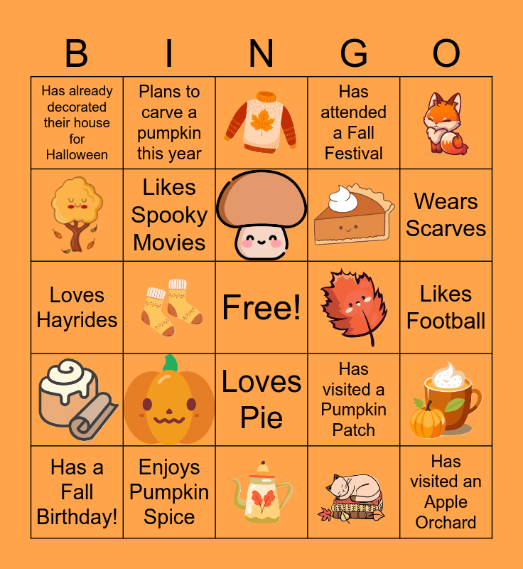 This bingo card has 12 images, a free space and 12 words: Enjoys Pumpkin Spice, Has a Fall Birthday!, Has already decorated their house for Halloween, Plans to carve a pumpkin this year, Loves Pie, Loves Hayrides, Has visited a Pumpkin Patch, Likes Spooky Movies, Likes Football, Wears Scarves, Has visited an Apple Orchard and Has attended a Fall Festival.