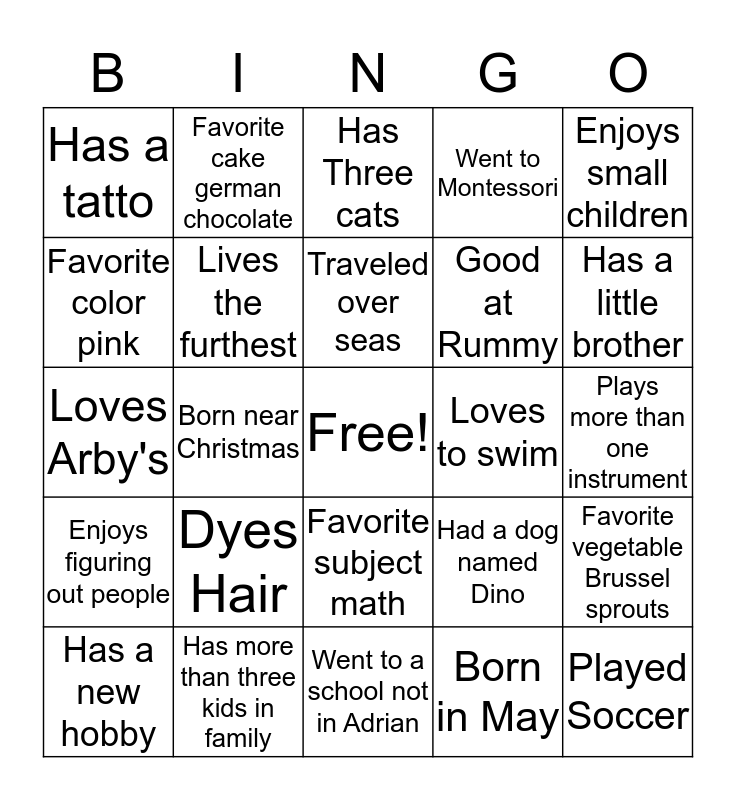 This bingo card has a free space and 24 words: Dyes Hair, Has more than three kids in family, Traveled over seas, Has a new hobby, Enjoys small children, Has a tatto, Favorite color pink, Favorite cake german chocolate, Loves to swim, Favorite subject math, Good at Rummy, Loves Arby's, Had a dog named Dino, Favorite vegetable Brussel sprouts, Lives the furthest, Born in May, Plays more than one instrument, Has Three cats, Has a little brother, Born near Christmas, Played Soccer, Enjoys figuring out people, Went to Montessori and Went to a school not in Adrian.