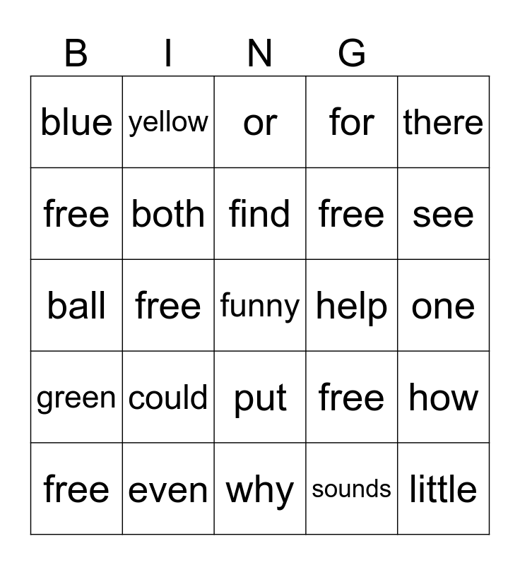 This bingo card has 25 words: could, why, find, free, there, blue, free, yellow, help, put, free, ball, free, how, both, little, one, or, see, free, funny, even, green, for and sounds.