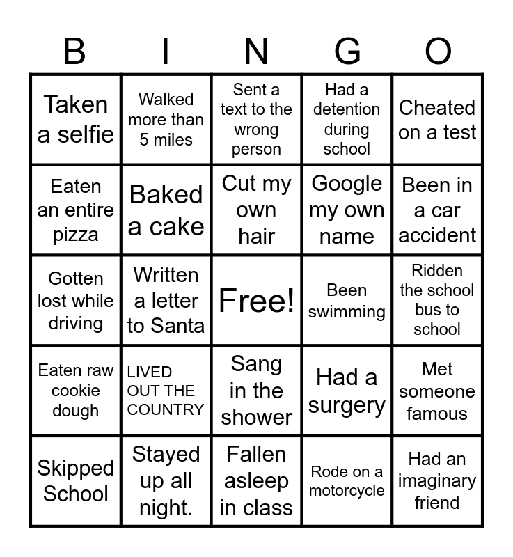 This bingo card has a free space and 24 words: LIVED OUT THE COUNTRY, Stayed up all night., Cut my own hair, Skipped School, Cheated on a test, Taken a selfie, Eaten an entire pizza, Walked more than 5 miles, Been swimming, Sang in the shower, Google my own name, Gotten lost while driving, Had a surgery, Met someone famous, Baked a cake, Rode on a motorcycle, Ridden the school bus to school, Sent a text to the wrong person, Been in a car accident, Written a letter to Santa, Had an imaginary friend, Eaten raw cookie dough, Had a detention during school and Fallen asleep in class.