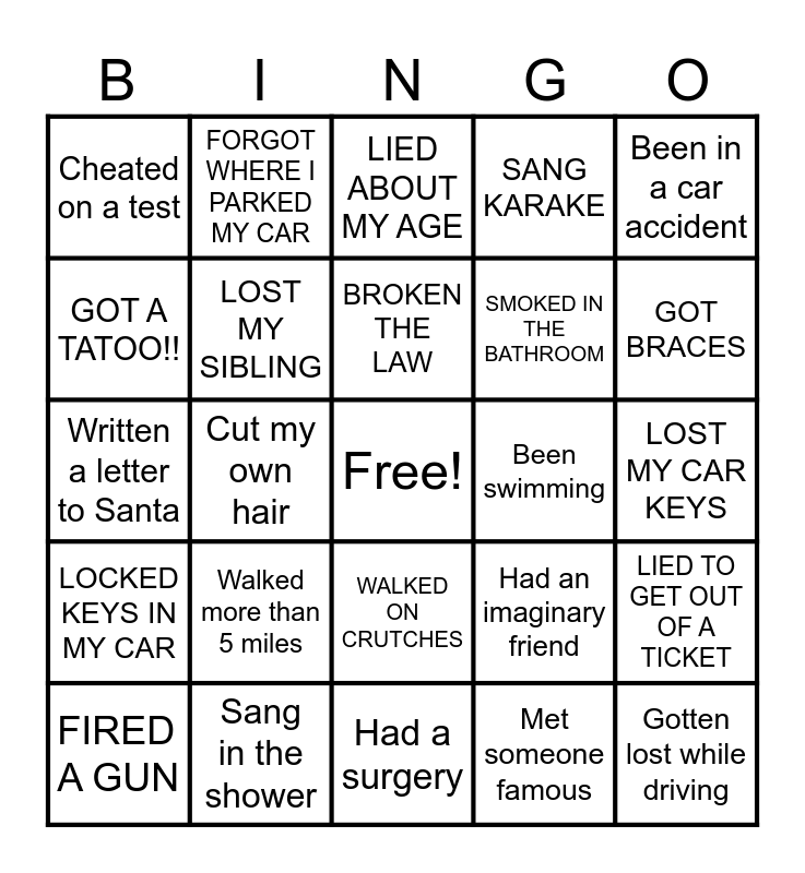 This bingo card has a free space and 29 words: FIRED A GUN, LIED TO MY CHILDREN, Cut my own hair, Skipped School, Cheated on a test, LIED ABOUT MY AGE, LOST MY SIBLING, Walked more than 5 miles, Been swimming, Sang in the shower, LOST MY CAR KEYS, Gotten lost while driving, Had a surgery, Met someone famous, GOT BRACES, Rode on a motorcycle, WALKED ON CRUTCHES, LOCKED KEYS IN MY CAR, Been in a car accident, Written a letter to Santa, Had an imaginary friend, Eaten raw cookie dough, SMOKED IN THE BATHROOM, GOT A TATOO!!, SANG KARAKE, FORGOT WHERE I PARKED MY CAR, LIED TO GET OUT OF A TICKET, BROKEN THE LAW and TREATED A PET LIKE A CHILD.