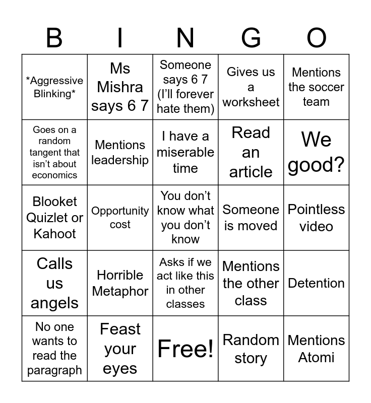 This bingo card has 25 words: Calls us angels, Feast your eyes, You don’t know what you don’t know, Random story, Mentions the soccer team, *Aggressive Blinking*, Ms Mishra says 6 7, Someone says 6 7 (I’ll forever hate them), Someone is moved, Detention, Goes on a random tangent that isn’t about economics, Mentions leadership, Free!, Mentions the other class, We good?, No one wants to read the paragraph, Opportunity cost, I have a miserable time, Read an article, Pointless video, Blooket Quizlet or Kahoot, Horrible Metaphor, Asks if we act like this in other classes, Gives us a worksheet and Mentions Atomi.