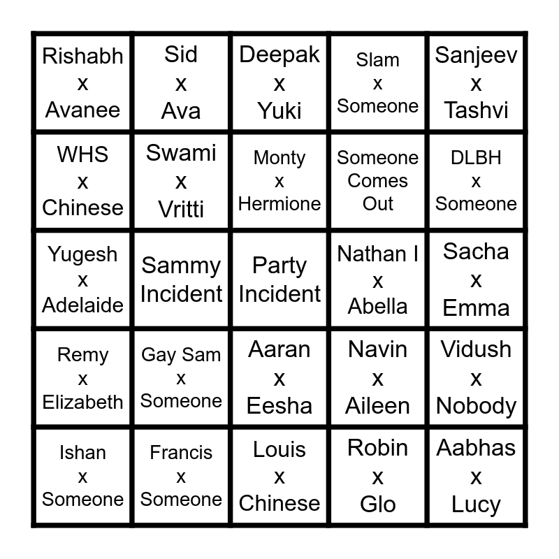 This bingo card has a free space and 24 words: Ishan x Someone, Gay Sam x Someone, Monty x Hermione, Robin x Glo, Sanjeev x Tashvi, Rishabh x Avanee, Sid x Ava, Deepak x Yuki, Nathan I x Abella, Sacha x Emma, Yugesh x Adelaide, Swami x Vritti, Navin x Aileen, Vidush x Nobody, WHS x Chinese, Francis x Someone, Louis x Chinese, Slam x Someone, DLBH x Someone, Remy x Elizabeth, Sammy Incident, Aaran x Eesha, Someone Comes Out and Aabhas x Lucy.