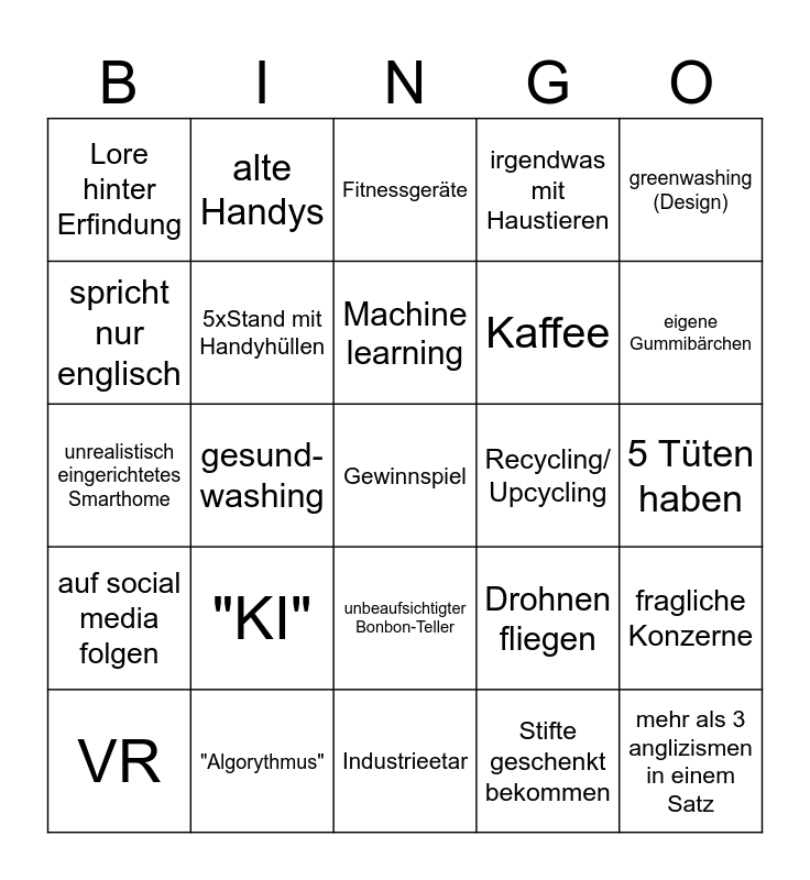 This bingo card has a free space and 24 words: "KI", "Algorythmus", Machine learning, VR, greenwashing (Design), Lore hinter Erfindung, spricht nur englisch, alte Handys, Recycling/ Upcycling, unbeaufsichtigter Bonbon-Teller, Kaffee, unrealistisch eingerichtetes Smarthome, Drohnen fliegen, fragliche Konzerne, 5xStand mit Handyhüllen, Stifte geschenkt bekommen, 5 Tüten haben, Fitnessgeräte, eigene Gummibärchen, gesund-washing, mehr als 3 anglizismen in einem Satz, auf social media folgen, irgendwas mit Haustieren and Industrieetar.
