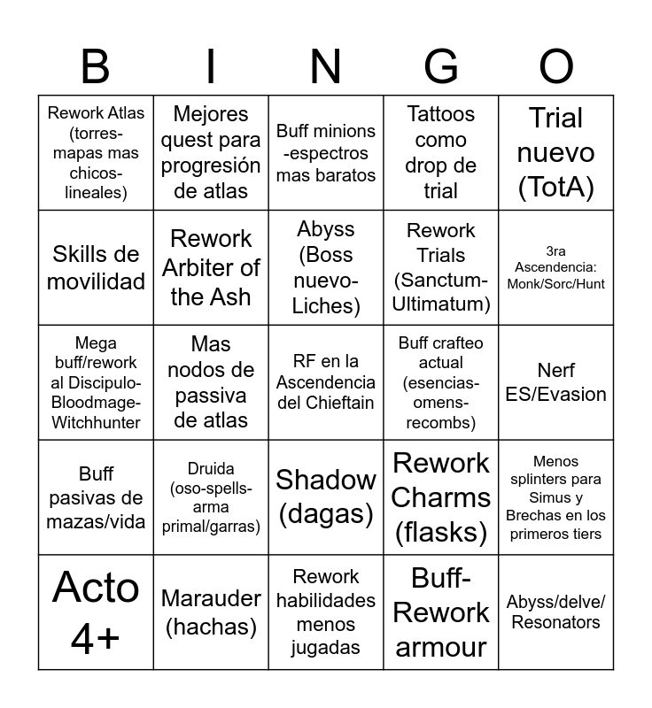 This bingo card has a free space and 24 words: Druida (oso-spells-arma primal/garras), Marauder (hachas), Abyss (Boss nuevo- Liches), Acto 4+, Trial nuevo (TotA), Rework Atlas (torres-mapas mas chicos-lineales), Skills de movilidad, Mejores quest para progresión de atlas, Buff crafteo actual (esencias- omens-recombs), Shadow (dagas), Rework Trials (Sanctum-Ultimatum), Mega buff/rework al Discipulo-Bloodmage- Witchhunter, Rework Charms (flasks), Menos splinters para Simus y Brechas en los primeros tiers, Rework Arbiter of the Ash, Buff-Rework armour, Nerf ES/Evasion, Buff minions -espectros mas baratos, 3ra Ascendencia: Monk/Sorc/Hunt, Mas nodos de passiva de atlas, Abyss/delve/ Resonators, Buff pasivas de mazas/vida, Tattoos como drop de trial and Rework habilidades menos jugadas.