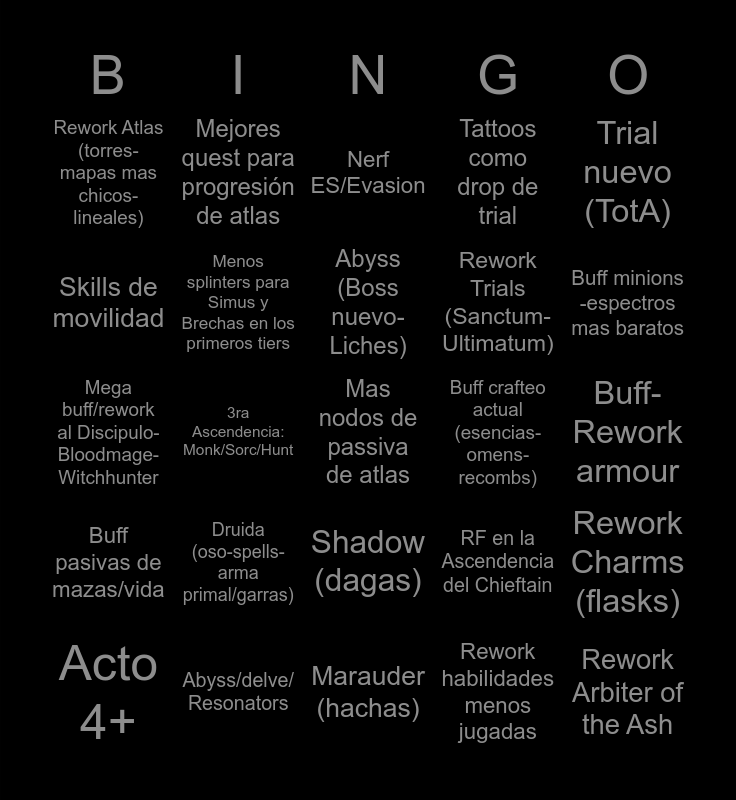 This bingo card has 25 words: Druida (oso-spells-arma primal/garras), Marauder (hachas), Abyss (Boss nuevo- Liches), Acto 4+, Trial nuevo (TotA), Rework Atlas (torres-mapas mas chicos-lineales), Skills de movilidad, Mejores quest para progresión de atlas, Buff crafteo actual (esencias- omens-recombs), Shadow (dagas), Rework Trials (Sanctum-Ultimatum), Mega buff/rework al Discipulo-Bloodmage- Witchhunter, RF en la Ascendencia del Chieftain, Rework Charms (flasks), Menos splinters para Simus y Brechas en los primeros tiers, Rework Arbiter of the Ash, Buff-Rework armour, Nerf ES/Evasion, Buff minions -espectros mas baratos, 3ra Ascendencia: Monk/Sorc/Hunt, Mas nodos de passiva de atlas, Abyss/delve/ Resonators, Buff pasivas de mazas/vida, Tattoos como drop de trial and Rework habilidades menos jugadas.
