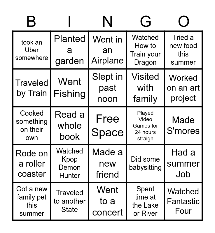 This bingo card has a free space and 24 words: Watched Kpop Demon Hunter, Traveled to another State, Slept in past noon, Got a new family pet this summer, Tried a new food this summer, took an Uber somewhere, Traveled by Train, Planted a garden, Played Video Games for 24 hours straigh, Made a new friend, Visited with family, Cooked something on their own, Did some babysitting, Had a summer Job, Went Fishing, Spent time at the Lake or River, Made S'mores, Went in an Airplane, Worked on an art project, Read a whole book, Watched Fantastic Four, Rode on a roller coaster, Watched How to Train your Dragon and Went to a concert.