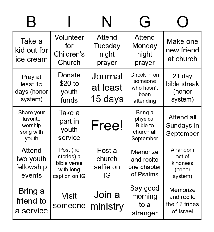 This bingo card has a free space and 24 words: Bring a friend to a service, Post (no stories) a bible verse with long caption on IG, Journal at least 15 days, Say good morning to a stranger, Make one new friend at church, Take a kid out for ice cream, Volunteer for Children’s Church, Attend Tuesday night prayer, Bring a physical Bible to church all September, Attend all Sundays in September, Share your favorite worship song with youth, Donate $20 to youth funds, Memorize and recite one chapter of Psalms, A random act of kindness (honor system), Pray at least 15 days (honor system), Visit someone, Join a ministry, Attend Monday night prayer, 21 day bible streak (honor system), Attend two youth fellowship events, Take a part in youth service, Post a church selfie on IG, Check in on someone who hasn’t been attending and Memorize and recite the 12 tribes of Israel.