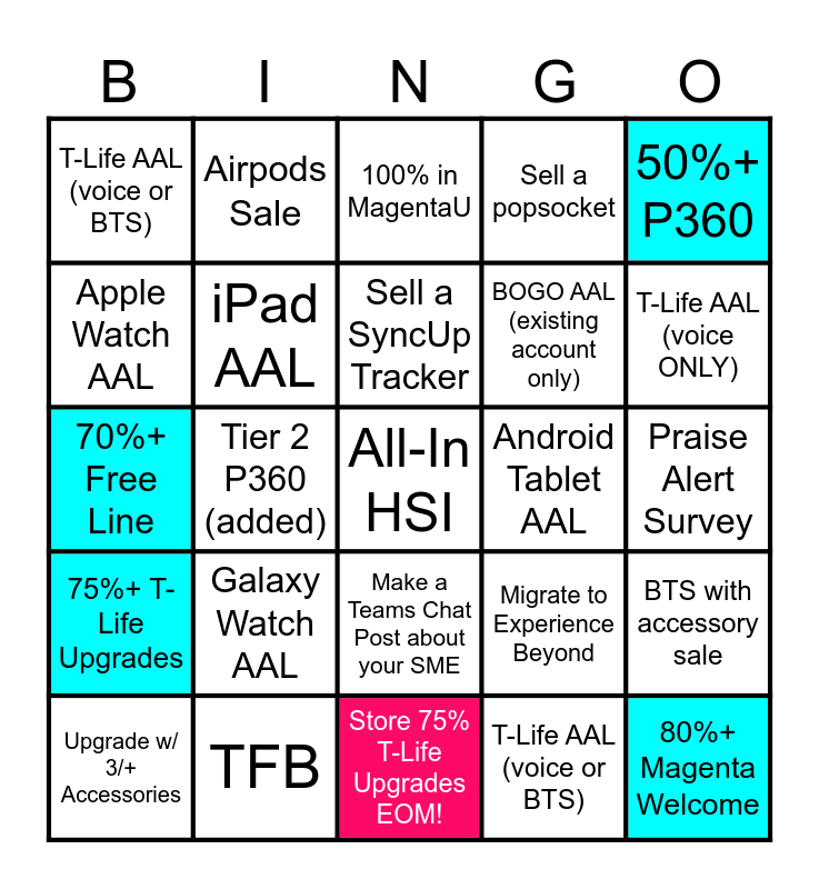 This bingo card has 25 words: 75%+ T-Life Upgrades, TFB, All-In HSI, T-Life AAL (voice or BTS), 50%+ P360, T-Life AAL (voice or BTS), Airpods Sale, 100% in MagentaU, Android Tablet AAL, BTS with accessory sale, Apple Watch AAL, iPad AAL, Store 75% T-Life Upgrades EOM!, Migrate to Experience Beyond, T-Life AAL (voice ONLY), Upgrade w/ 3/+ Accessories, Tier 2 P360 (added), Sell a SyncUp Tracker, BOGO AAL (existing account only), Praise Alert Survey, 70%+ Free Line, Galaxy Watch AAL, Make a Teams Chat Post about your SME, Sell a popsocket and 80%+ Magenta Welcome.
