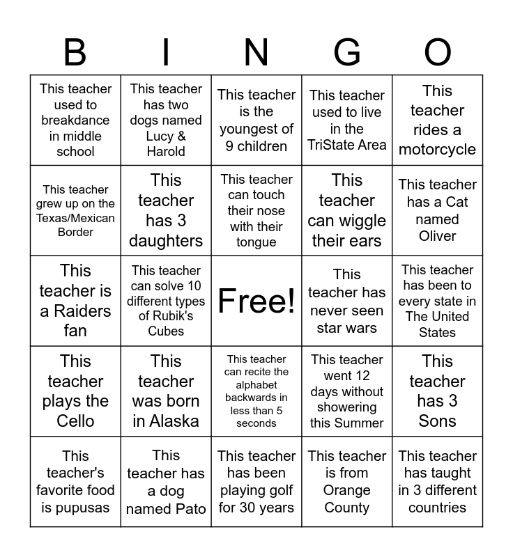 This bingo card has a free space and 24 words: This teacher was born in Alaska, This teacher has a dog named Pato, This teacher can touch their nose with their tongue, This teacher's favorite food is pupusas, This teacher rides a motorcycle, This teacher used to breakdance in middle school, This teacher grew up on the Texas/Mexican Border, This teacher has two dogs named Lucy & Harold, This teacher has never seen star wars, This teacher can recite the alphabet backwards in less than 5 seconds, This teacher can wiggle their ears, This teacher is a Raiders fan, This teacher went 12 days without showering this Summer, This teacher has 3 Sons, This teacher has 3 daughters, This teacher is from Orange County, This teacher has been to every state in The United States, This teacher is the youngest of 9 children, This teacher has a Cat named Oliver, This teacher can solve 10 different types of Rubik's Cubes, This teacher has taught in 3 different countries, This teacher plays the Cello, This teacher used to live in the TriState Area and This teacher has been playing golf for 30 years.