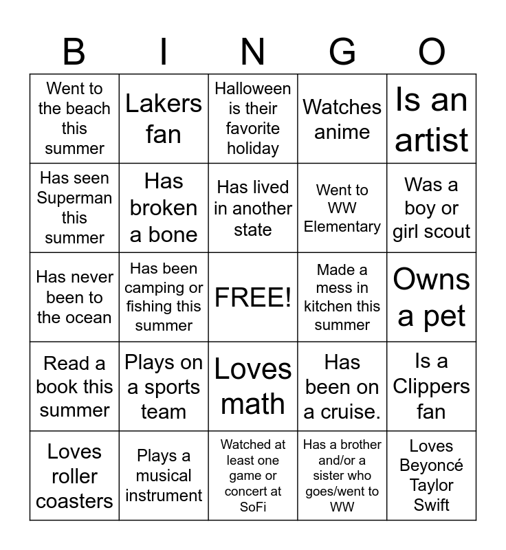 This bingo card has a free space and 24 words: Plays on a sports team, Plays a musical instrument, Has lived in another state, Loves roller coasters, Is an artist, Went to the beach this summer, Has seen Superman this summer, Lakers fan, Made a mess in kitchen this summer, Loves math, Went to WW Elementary, Has never been to the ocean, Has been on a cruise., Is a Clippers fan, Has broken a bone, Has a brother and/or a sister who goes/went to WW, Owns a pet, Halloween is their favorite holiday, Was a boy or girl scout, Has been camping or fishing this summer, Loves Beyoncé Taylor Swift, Read a book this summer, Watches anime and Watched at least one game or concert at SoFi.