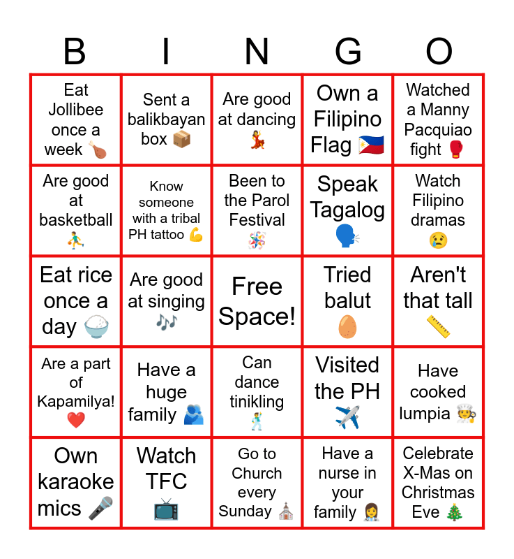 This bingo card has a free space and 24 words: Have a huge family đĢ, Watch TFC đē, Been to the Parol Festival đĒ , Own karaoke mics đ¤, Watched a Manny Pacquiao fight đĨ, Eat Jollibee once a week đ, Are good at basketball âšī¸ââī¸, Sent a balikbayan box đĻ, Tried balut đĨ, Can dance tinikling đē, Speak Tagalog đŖ, Eat rice once a day đ, Visited the PH âī¸, Have cooked lumpia đ§âđŗ, Know someone with a tribal PH tattoo đĒ, Have a nurse in your family đŠââī¸, Aren't that tall đ, Are good at dancing đ, Watch Filipino dramas đĸ, Are good at singing đļ, Celebrate X-Mas on Christmas Eve đ, Are a part of Kapamilya! â¤ī¸, Own a Filipino Flag đĩđ and Go to Church every Sunday âĒī¸.