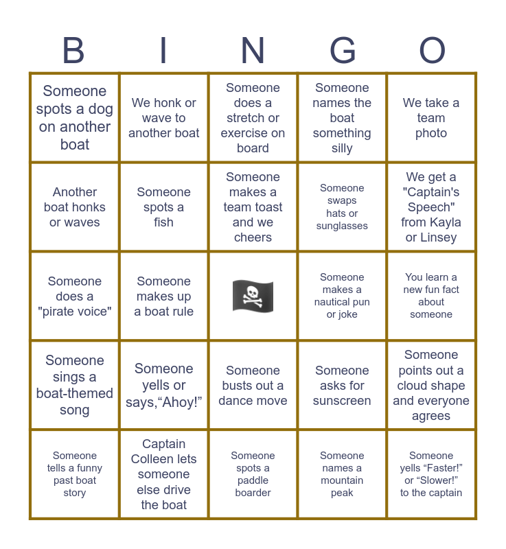 This bingo card has a free space and 24 words: Someone yells or says,“Ahoy!”, Captain Colleen lets someone else drive the boat, Someone makes a team toast and we cheers, Someone tells a funny past boat story, We take a team photo, Someone spots a dog on another boat, Another boat honks or waves, We honk or wave to another boat, Someone makes a nautical pun or joke, Someone busts out a dance move, Someone swaps hats or sunglasses, Someone does a "pirate voice", Someone asks for sunscreen, Someone points out a cloud shape and everyone agrees, Someone spots a fish, Someone names a mountain peak, You learn a new fun fact about someone, Someone does a stretch or exercise on board, We get a "Captain's Speech" from Kayla or Linsey, Someone makes up a boat rule, Someone yells “Faster!” or “Slower!” to the captain, Someone sings a boat-themed song, Someone names the boat something silly and Someone spots a paddle boarder.