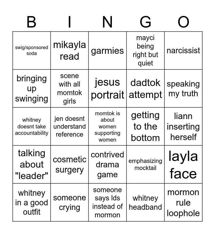 This bingo card has a free space and 40 words: critical lore instantly abandoned, whitney doesnt take accountability, therapy, scene with all momtok girls, someone crying, contrived drama game, jesus portrait, not invited/uninvited, narcissist, talking about "leader", jen doesnt understand reference, mayci being right but quiet, mormon rule loophole, liann inserting herself, getting to the bottom, cosmetic surgery, give her some grace, swig/sponsored soda, child in scene, garmies, layla face, whitney headband, dadtok attempt, bringing up swinging, mayci as messenger, insanely worded threat, receipts are shown, being a good or bad friend, mentioning business and friendship, specific shot of street leading to temple, overly on the nose lyrics, whitney in a good outfit, whitney in a bad outfit, emphasizing mocktail, speaking my truth, someone says lds instead of mormon, claim of being more mormon, taylor brought us all here, mikayla read and protecting my peace.