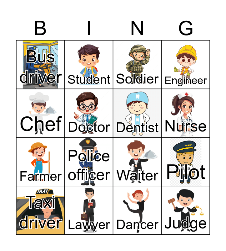 This bingo card has 20 images and 20 words: Pilot, Singer, Soldier, Teacher, Taxi driver, Chef, Lawyer, Bus driver, Farmer, Student, Police officer, Waiter, Doctor, Judge, Dentist, Actor, Nurse, Engineer, Dancer and Scientist.