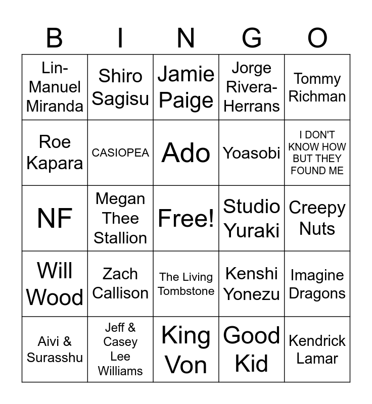 This bingo card has a free space and 24 words: Zach Callison, Jeff & Casey Lee Williams, Ado, Aivi & Surasshu, Tommy Richman, Lin-Manuel Miranda, Roe Kapara, Shiro Sagisu, Studio Yuraki, The Living Tombstone, Yoasobi, NF, Kenshi Yonezu, Imagine Dragons, CASIOPEA, Good Kid, Creepy Nuts, Jamie Paige, I DON'T KNOW HOW BUT THEY FOUND ME, Megan Thee Stallion, Kendrick Lamar, Will Wood, Jorge Rivera-Herrans and King Von.