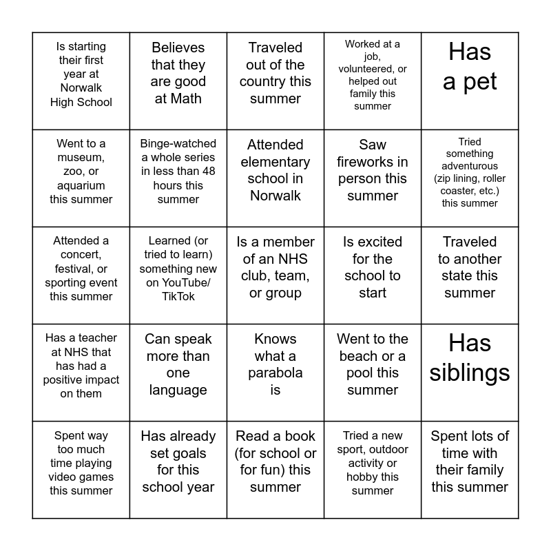 This bingo card has 25 words: Can speak more than one language, Read a book (for school or for fun) this summer, Attended elementary school in Norwalk, Spent way too much time playing video games this summer, Has a pet, Is starting their first year at Norwalk High School, Went to a museum, zoo, or aquarium this summer, Believes that they are good at Math, Is excited for the school to start, Knows what a parabola is, Saw fireworks in person this summer, Attended a concert, festival, or sporting event this summer, Went to the beach or a pool this summer, Has siblings, Binge-watched a whole series in less than 48 hours this summer, Spent lots of time with their family this summer, Traveled to another state this summer, Traveled out of the country this summer, Tried something adventurous (zip lining, roller coaster, etc.) this summer, Learned (or tried to learn) something new on YouTube/ TikTok, Is a member of an NHS club, team, or group, Has already set goals for this school year, Has a teacher at NHS that has had a positive impact on them, Worked at a job, volunteered, or helped out family this summer and Tried a new sport, outdoor activity or hobby this summer.