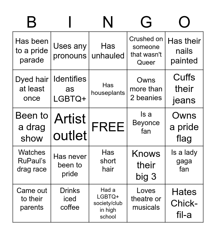 This bingo card has a free space and 34 words: Wears multiple rings, Is an ally, Been out of the closet for over 1 year, Been to the pride parade more than once, Owns a pride flag, Dyed hair at least once, Identifies as LGBTQ+, Had a LGBTQ+ society/club in high school, Owns more than 2 beanies, Hates Chick-fil-a, Been to a drag show, Uses any pronouns, Loves theatre or musicals, Has their nails painted, Watches RuPaul’s drag race, Artist outlet, Has short hair, Is a Beyonce fan, Is a lady gaga fan, Came out to their parents, Drinks iced coffee, Has more than 5 piercings, Crushed on someone that wasn't Queer, Cuffs their jeans, Did/does theater, Has never been to pride, Has unhauled, Shares the same zodiac as you, Has their nails painted, Has been to a pride parade, Changed their name, Has houseplants, Knows their big 3 and Has a pride flag in their room.