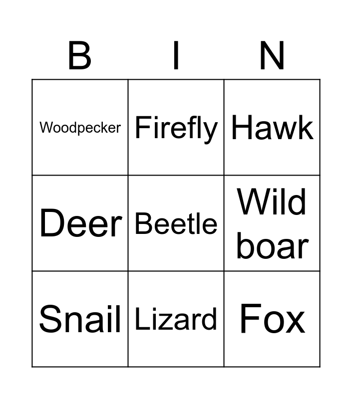 This bingo card has a free space and 14 words: Beetle, Owl, Snail, Firefly, Deer, Fox, Racoon, Bee, Lizard, Woodpecker, Squirrel, Wild boar, Hawk and Capybara.