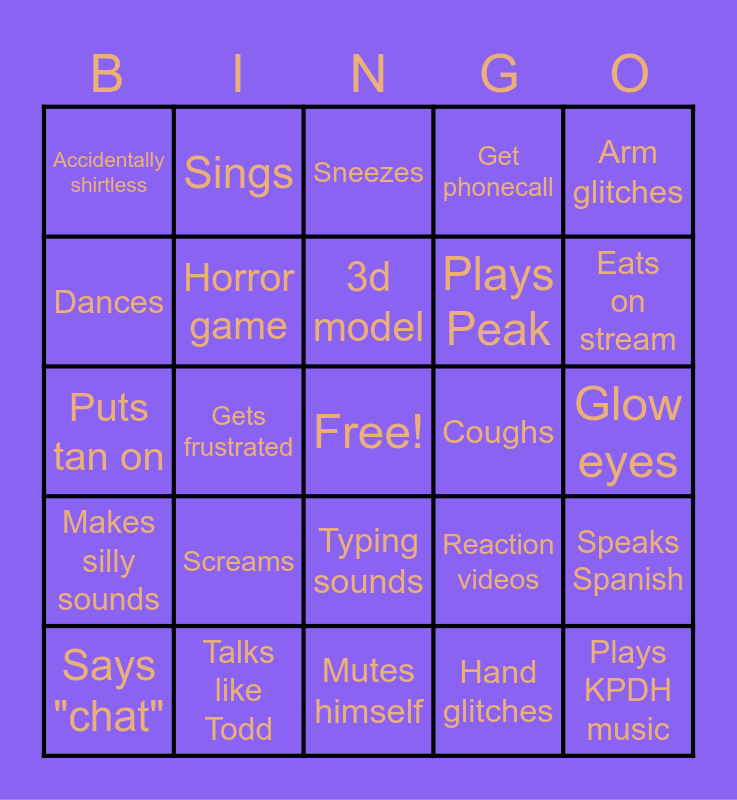 This bingo card has a free space and 24 words: Says "chat", Screams, 3d model, Hand glitches, Arm glitches, Accidentally shirtless, Sings, Sneezes, Coughs, Glow eyes, Puts tan on, Horror game, Reaction videos, Speaks Spanish, Dances, Talks like Todd, Mutes himself, Get phonecall, Eats on stream, Makes silly sounds, Gets frustrated, Typing sounds, Plays Peak and Plays KPDH music.