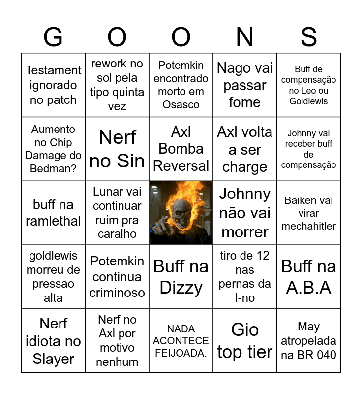 This bingo card has a free space and 24 words: Potemkin continua criminoso, Nerf no Axl por motivo nenhum, Axl Bomba Reversal, Nerf idiota no Slayer, Buff de compensação no Leo ou Goldlewis, Testament ignorado no patch, Aumento no Chip Damage do Bedman?, rework no sol pela tipo quinta vez, Johnny não vai morrer, Buff na Dizzy, Axl volta a ser charge, buff na ramlethal, tiro de 12 nas pernas da I-no, Buff na A.B.A, Nerf no Sin, Gio top tier, Baiken vai virar mechahitler, Potemkin encontrado morto em Osasco, Johnny vai receber buff de compensação, Lunar vai continuar ruim pra caralho, May atropelada na BR 040, goldlewis morreu de pressao alta, Nago vai passar fome and NADA ACONTECE FEIJOADA..