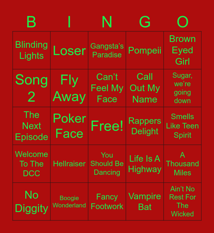 This bingo card has a free space and 50 words: Just A Girl, Ainβt No Rest For The Wicked, Edge of Seventeen, Fancy Footwork, Hellraiser, I Believe In A Thing Called Love, Loser, Bad Reputation, Song 2, Should I Stay Or Should I Go?, Fly Away, Pompeii, A Thousand Miles, Life Is A Highway, Stayin Alive, The Final Countdown, Canβt Feel My Face, Rappers Delight, Lose Yourself, Brown Eyed Girl, Poker Face, Vampire Bat, Blinding Lights, Call Out My Name, Juicy, Feel Good Inc., Sugar, weβre going down, What I Got, Gangstaβs Paradise, You Should Be Dancing, Electric Feel, Ride Wit Me, One More Time, Dirty Little Secret, Boogie Wonderland, Congratulations, Come & Go, Satanized, Headstrong, Smells Like Teen Spirit, BYOB, Faint, Freak On A Leash, SAD!, No Diggity, The Next Episode, Candy Shop, Cyanide, Welcome To The DCC and The Emperor.