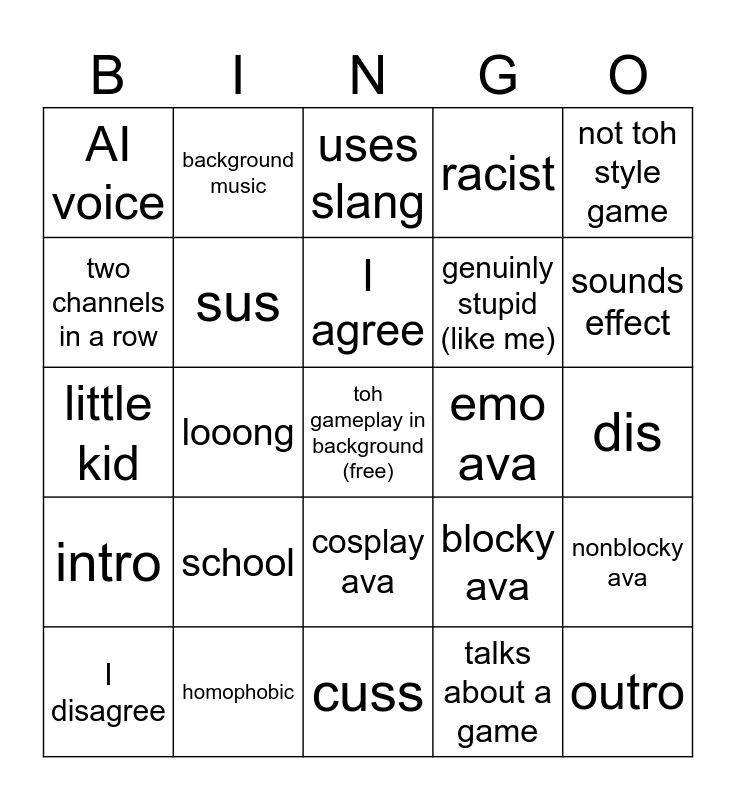 This bingo card has a free space and 24 words: school, homophobic, I agree, I disagree, not toh style game, AI voice, two channels in a row, background music, emo ava, cosplay ava, genuinly stupid (like me), little kid, blocky ava, nonblocky ava, sus, talks about a game, dis, uses slang, sounds effect, looong, outro, intro, racist and cuss.