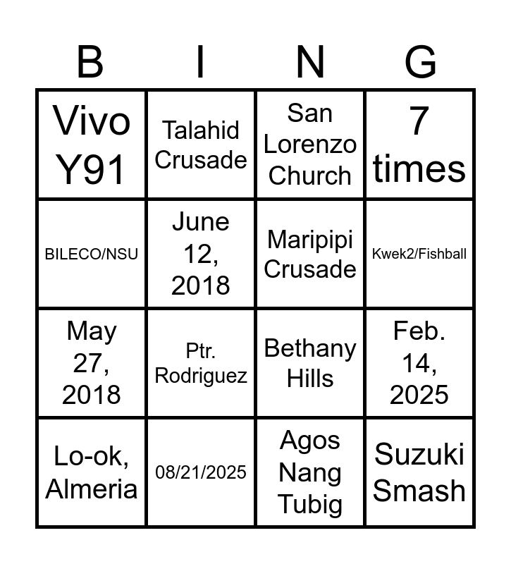 This bingo card has 16 words: 08/21/2025, Feb. 14, 2025, San Lorenzo Church, Vivo Y91, May 27, 2018, Talahid Crusade, Bethany Hills, Agos Nang Tubig, BILECO/NSU, June 12, 2018, Lo-ok, Almeria, 7 times, Ptr. Rodriguez, Kwek2/Fishball, Maripipi Crusade and Suzuki Smash.