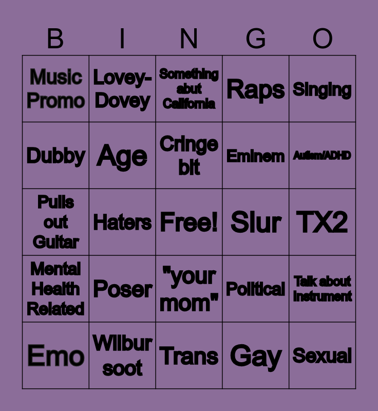 This bingo card has a free space and 26 words: "your mom", Gay, Cringe bit, Wilbur soot, Singing, Music Promo, Dubby, Lovey-Dovey, TX2, Political, Eminem, Pulls out Guitar, Talk about Instrument, Emo, Haters, Metal Scream, Raps, Mental Health Related, Something abut California, Sexual, Autism/ADHD, Trans, Slur, Poser, Age and Punk.