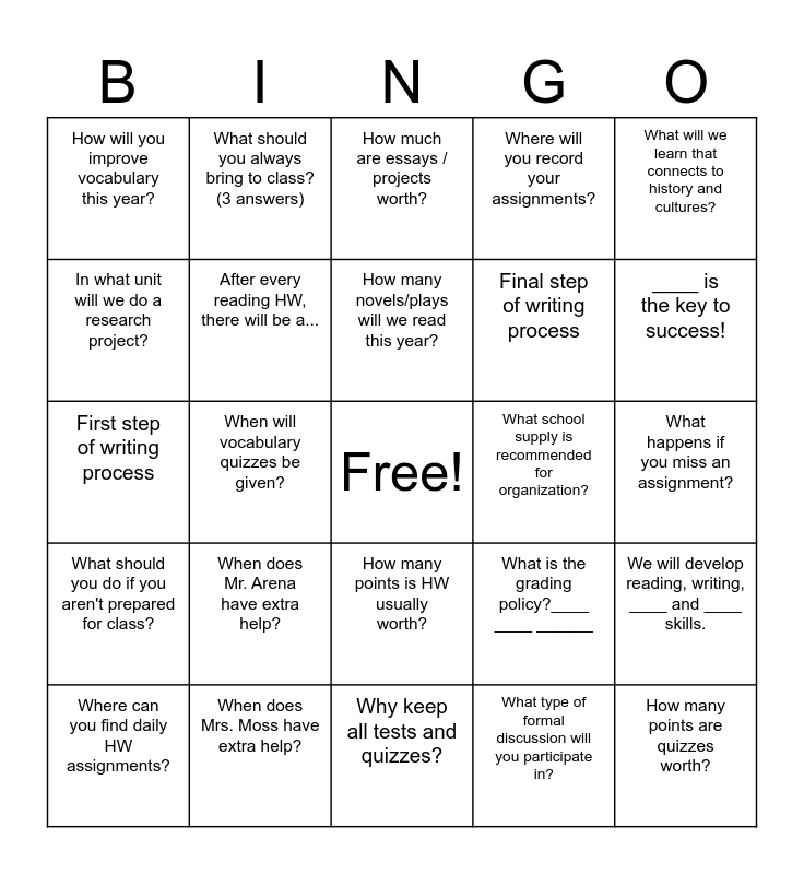 This bingo card has a free space and 24 words: When does Mr. Arena have extra help?, When does Mrs. Moss have extra help?, How many novels/plays will we read this year?, Where can you find daily HW assignments?, What will we learn that connects to history and cultures?, How will you improve vocabulary this year?, In what unit will we do a research project?, What should you always bring to class? (3 answers), What school supply is recommended for organization?, How many points is HW usually worth?, Final step of writing process, First step of writing process, What is the grading policy?____ ____ ______, We will develop reading, writing, ____ and ____ skills., After every reading HW, there will be a..., What type of formal discussion will you participate in?, What happens if you miss an assignment?, How much are essays / projects worth?, ____ is the key to success!, When will vocabulary quizzes be given?, How many points are quizzes worth?, What should you do if you aren't prepared for class?, Where will you record your assignments? and Why keep all tests and quizzes?.