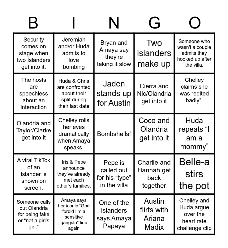 This bingo card has a free space and 29 words: Someone calls out Olandria for being fake or “not a girl’s girl.”, Ace interrupts Jeremiah., Chelley rolls her eyes dramatically when Amaya speaks., Nic insists his relationship with Olandria is “100% real”, Security comes on stage when two Islanders get into it., Bryan and Amaya say they're taking it slow, Huda & Chris are confronted about their split during their last date, Iris & Pepe announce they’ve already met each other’s families., Coco and Olandria get into it, Amaya says her iconic “God forbid I’m a sensitive gangsta” line again, Huda repeats “I am a mommy”, Chelley and Huda argue over the heart rate challenge clip, One of the islanders says Amaya Papaya, Austin flirts with Ariana Madix, Chelley claims she was “edited badly”., Islander plugs a new brand partnership or social campaign., Pepe is called out for his “type” in the villa, A viral TikTok of an islander is shown on screen., Someone who wasn't a couple admits they hooked up after the villa., Olandria and Taylor/Clarke get into it, Charlie and Hannah get back together, Zak is questioned about his authenticity on the show, Cierra and Nic/Olandria get into it, The hosts are speechless about an interaction, Two islanders make up, Jeremiah and/or Huda admits to love bombing, Belle-a stirs the pot, Jaden stands up for Austin and Someone mentions their DMs are “blowing up” after the show.