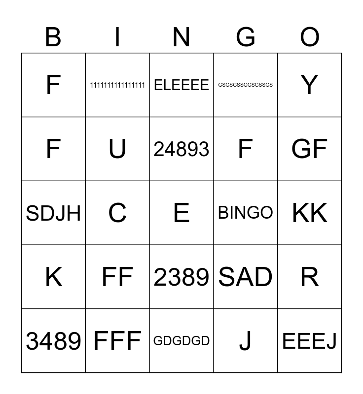 This bingo card has a free space and 24 words: FF, FFF, 24893, 3489, Y, F, F, 1111111111111111, BINGO, 2389, F, SDJH, SAD, R, U, J, KK, ELEEEE, GF, C, EEEJ, K, GSGSGSSGGSGSSGS and GDGDGD.
