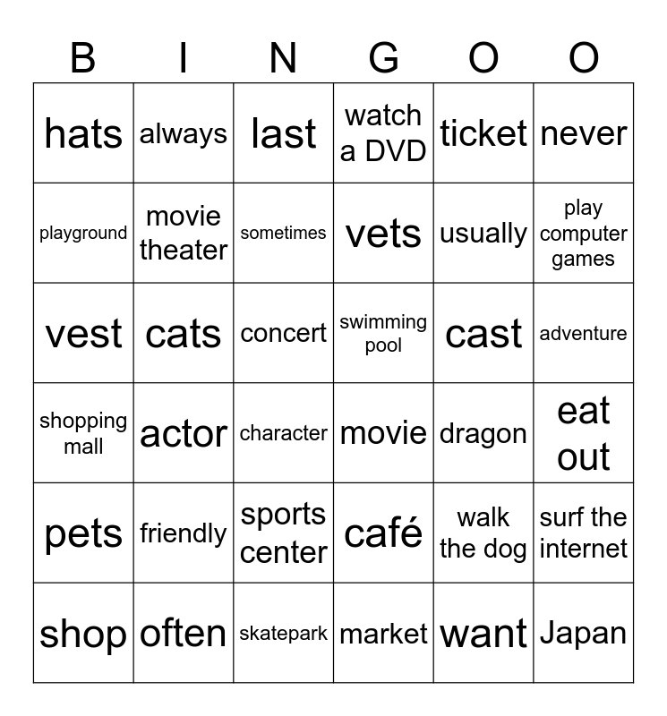 This bingo card has 36 words: café, sports center, market, playground, shopping mall, swimming pool, movie theater, skatepark, ticket, walk the dog, play computer games, watch a DVD, surf the internet, cats, vets, hats, pets, cast, vest, last, concert, actor, movie, character, dragon, always, usually, often, sometimes, never, Japan, shop, eat out, adventure, friendly and want.