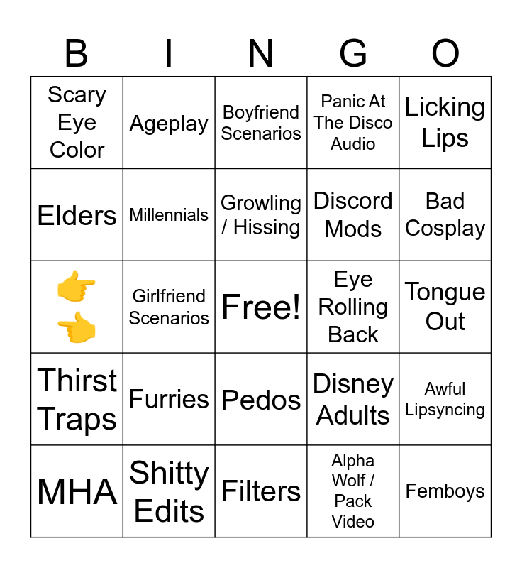 This bingo card has a free space and 24 words: MHA, Furries, Growling / Hissing, Alpha Wolf / Pack Video, Licking Lips, Scary Eye Color, Ageplay, Boyfriend Scenarios, Eye Rolling Back, Tongue Out, 👉👈, Millennials, Disney Adults, Awful Lipsyncing, Elders, Shitty Edits, Filters, Panic At The Disco Audio, Bad Cosplay, Thirst Traps, Girlfriend Scenarios, Pedos, Discord Mods and Femboys.