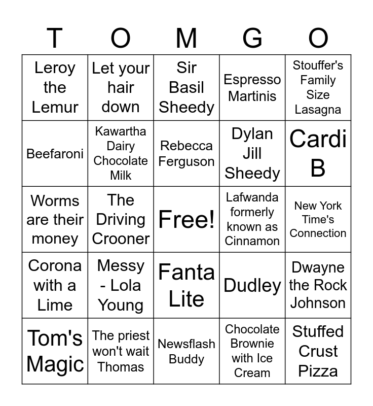 This bingo card has a free space and 39 words: Our Lord & Saviour Josh Allen, Tom the Rhino, Glizzies, Kawartha Dairy Chocolate Milk, Tom's Magic, Fanta Lite, Rebecca Ferguson, Dessert for Dinner, Stouffer's Family Size Lasagna, Corona with a Lime, The Driving Crooner, Espresso Martinis, Stuffed Crust Pizza, New York Time's Connection, Lafwanda formerly known as Cinnamon, Messy - Lola Young, Nerf Guns, Leroy the Lemur, Terry Fox, Dudley, Beefaroni, Newsflash Buddy, Dylan Jill Sheedy, Cardi B, Sir Basil Sheedy, Hubba Bubba, Sweating @ Corner House, Ciao, Zyns, Let your hair down, Can of Corn, Ripped Skinny Jeans, Sir Basil Sheedy, The priest won't wait Thomas, Chocolate Brownie with Ice Cream, Buffalo Bills, Dwayne the Rock Johnson, Worms are their money and Ground Beef Waffle Stomp.